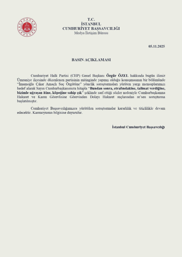 Başsavcılık, Özel'in Sayın Cumhurbaşkanımıza hitaben sarf ettiği “Bundan sonra, etrafındakine, talimat verdiğine, bizimle uğraşan itine, köpeğine sahip çık” şeklindeki sözleri nedeniyle harekete geçti. Bu ifadelerin, "Cumhurbaşkanına Hakaret" ve "Kamu Görevlisine Görevinden Dolayı Hakaret" suçlarını oluşturduğu gerekçesiyle Özel hakkında re'sen soruşturma başlatıldığı ifade edildi. Açıklama, "Cumhuriyet Başsavcılığımızca yürütülen soruşturmalar kararlılık ve titizlikle devam edecektir. Kamuoyunun bilgisine duyurulur" ifadeleriyle son buldu.