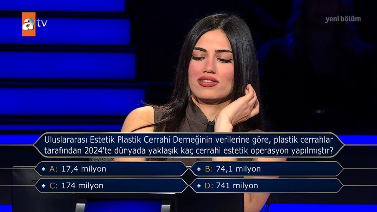 Kim Milyoner Olmak İster yarışmasının yeni bölümünde tıp ve estetik alanına dair dikkat çekici bir soru yöneltildi. Yarışmacıya, dünyada 2024 yılı boyunca gerçekleştirilen estetik operasyon sayısına ilişkin veriler soruldu. Soru, hem sağlık hem de sosyal yaşam alanında ilgi uyandırdı.