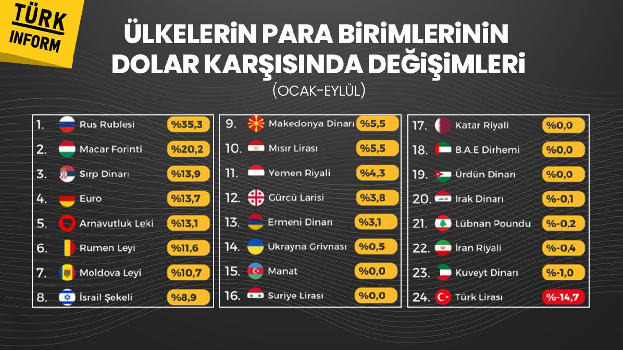 Sıralamada son sırada yer alan Türk lirası, aynı dönemde dolar karşısında yüzde 14,7 oranında değer kaybetti. Böylece Türk lirası, yılın ilk dokuz ayında en fazla değer kaybeden para birimi olarak dikkat çekti.