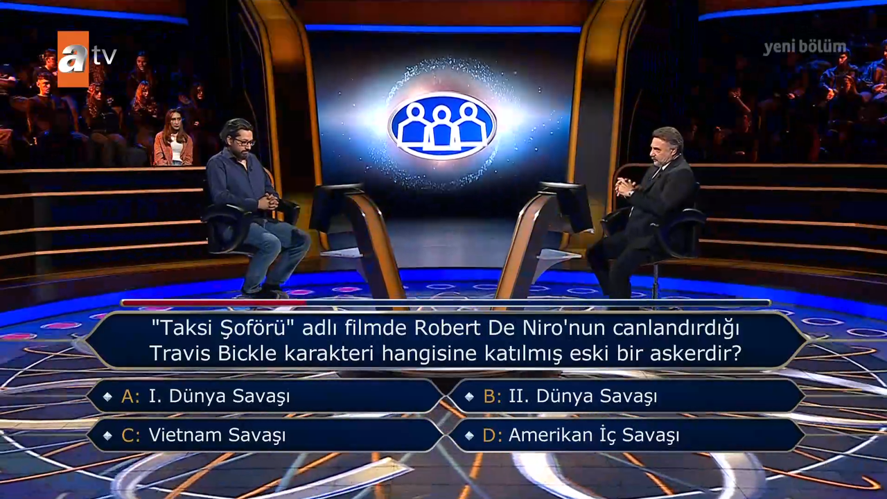 Kim Milyoner Olmak İster yarışmasının son bölümünde sinema tarihinin kült yapımlarından biri olan “Taksi Şoförü” filmiyle ilgili bir soru soruldu. Yarışmacıya yöneltilen soruda, Robert De Niro’nun hayat verdiği Travis Bickle karakterinin hangi savaşa katılmış eski bir asker olduğu soruldu. Şıklar ise şöyleydi: A: I. Dünya Savaşı, B: II. Dünya Savaşı, C: Vietnam Savaşı, D: Amerikan İç Savaşı.