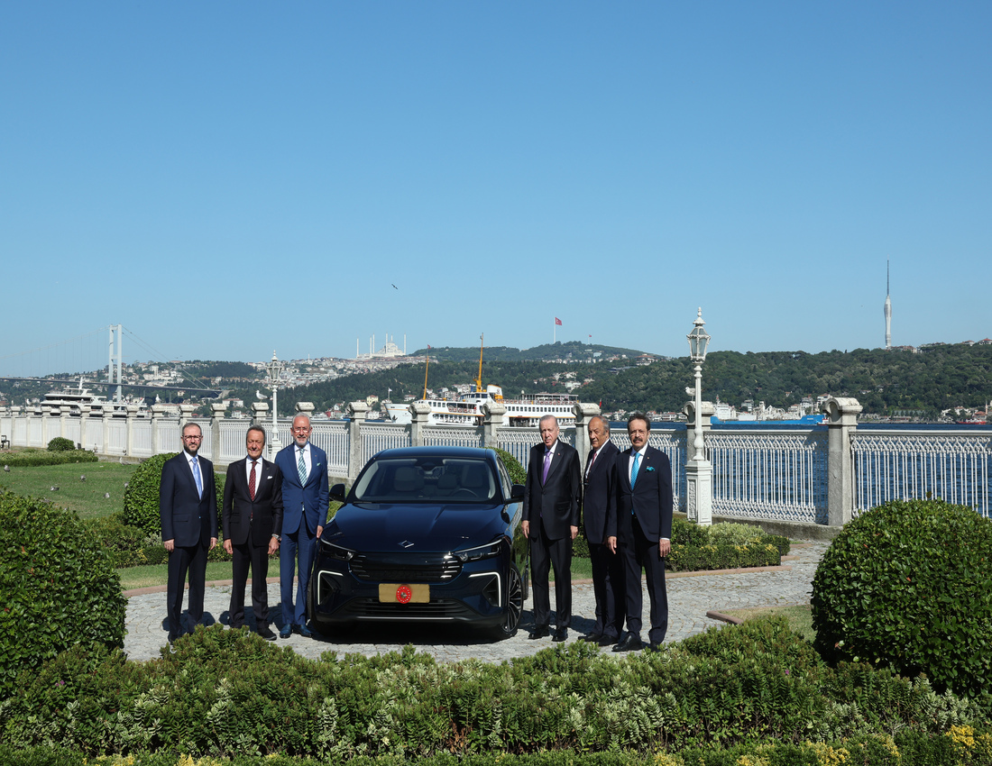 Cumhurbaşkanı Erdoğan ile Türkiye Odalar ve Borsalar Birliği Başkanı Rifat Hisarcıklıoğlu, Anadolu Grubu Yönetim Kurulu Başkanı Tuncay Özilhan, Zorlu Holding Yönetim Kurulu Başkanı Ahmet Nazif Zorlu, Turkcell Yönetim Kurulu Başkanı Şenol Kazancı ve Tosyalı Holding Yönetim Kurulu Başkanı Fuat Tosyalı, T10F modeli önünde hatıra fotoğrafı çektirdi.