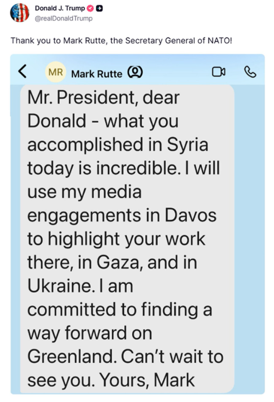 NATO Genel Sekreteri Mark Rutte, Trump'a hitaben yazdığı mesajda Suriye'deki gelişmeler ve Davos'taki temaslarına ilişkin şu ifadeleri kullandı: