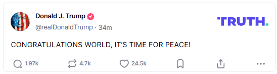 "Belki İran artık bölgede barış ve uyuma doğru ilerleyebilir ve ben de İsrail'i aynı şeyi yapmaya şevkle teşvik edeceğim" ifadelerini kullanan Trump, "Tebrikler dünya, şimdi barış zamanı" dedi.