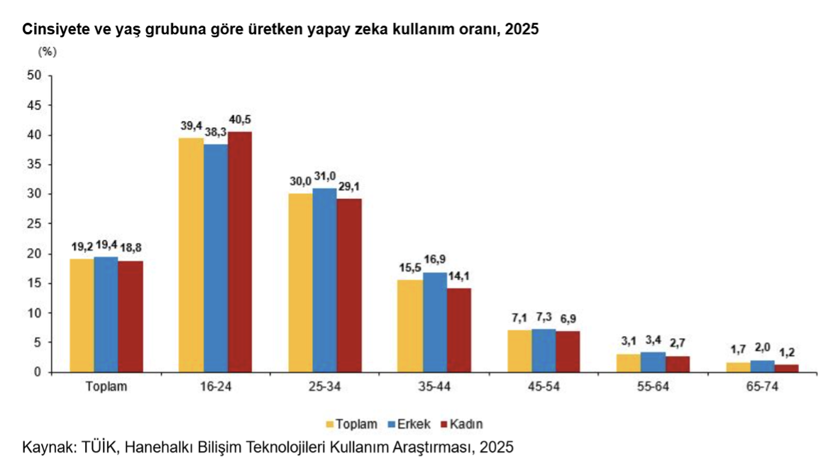 TÜİK, “Hanehalkı Bilişim Teknolojileri Kullanım Araştırması” kapsamında 16-74 yaş grubu bireylerin üretken yapay zeka kullanımına ilişkin ilk resmi verileri 2025’te açıkladı; bu veriler, Türkiye’de bireylerin teknolojiyi günlük yaşam ve iş hayatında nasıl benimsediğini gözler önüne seriyor.