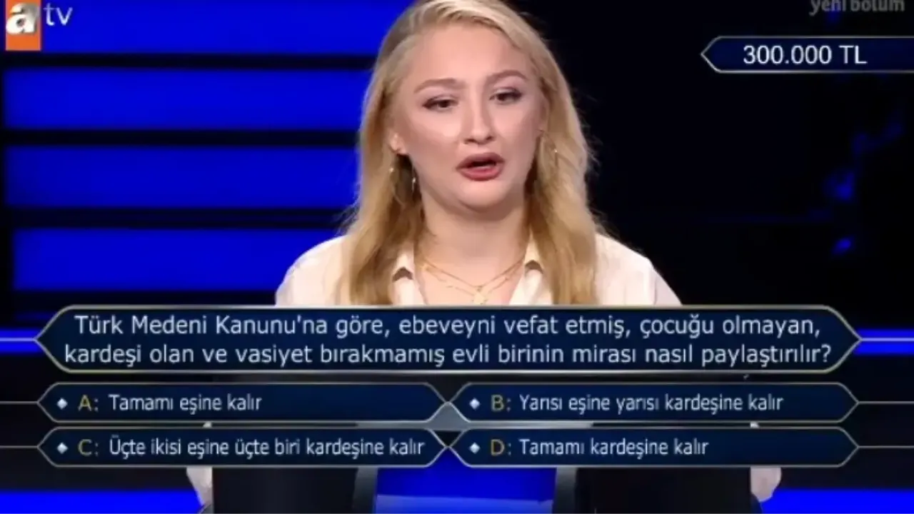 ATV ekranlarının sevilen bilgi yarışması "Kim Milyoner Olmak İster", yine izleyenleri ekran başına kilitleyen bir bölümle gündeme geldi. Yarışmanın son bölümünde yöneltilen sorulardan biri, Türk Medeni Kanunu’na dairydi ve cevabı hem yarışmacıyı hem de izleyicileri epey düşündürdü. Sorunun ardından “Türk Medeni Kanunu’na göre, ebeveyni vefat etmiş, çocuğu olmayan, kardeşi olan ve vasiyet bırakmamış evli birinin mirası nasıl paylaştırılır?” sorusu Google’da en çok aratılanlar arasında yerini aldı.