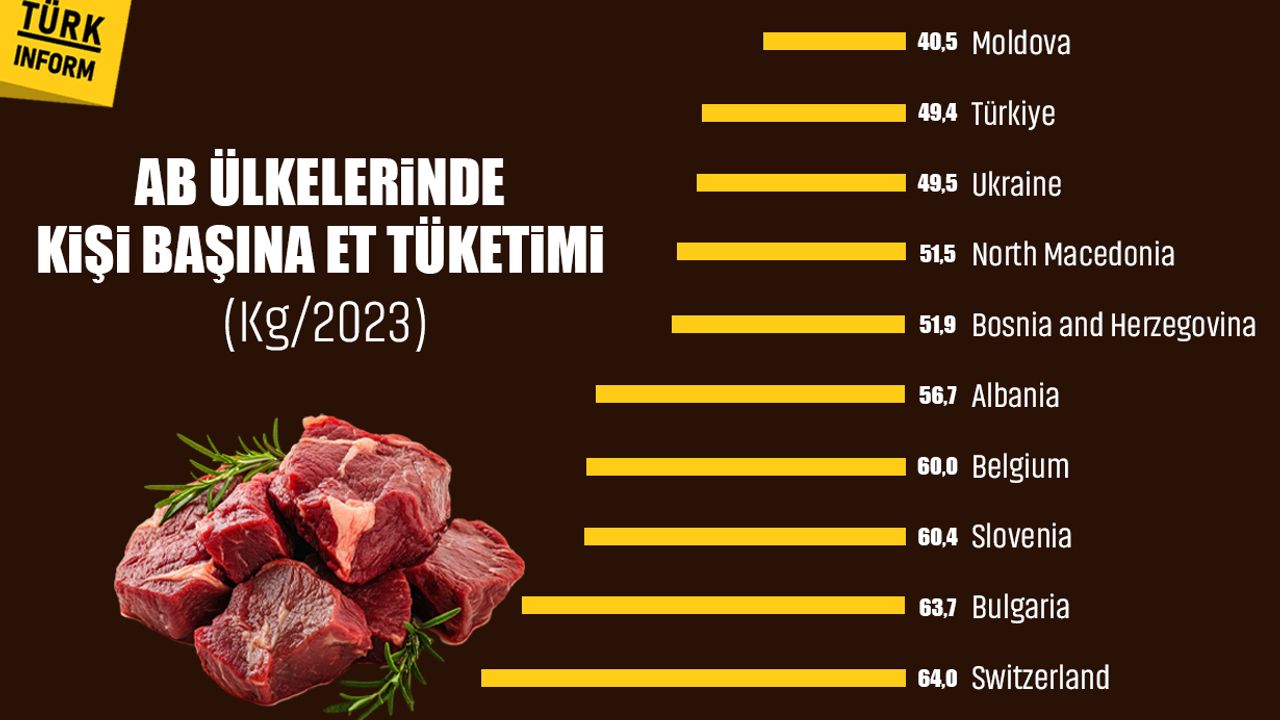 Avrupa Birliği ülkelerinde kişi başına et tüketimi genellikle Türkiye’nin çok üzerindedir. Avrupa ülkelerinin bazıları 80-100 kg civarında yıllık et tüketirken, Türkiye’nin bu ortalamaların çok altında kaldığı görülüyor.