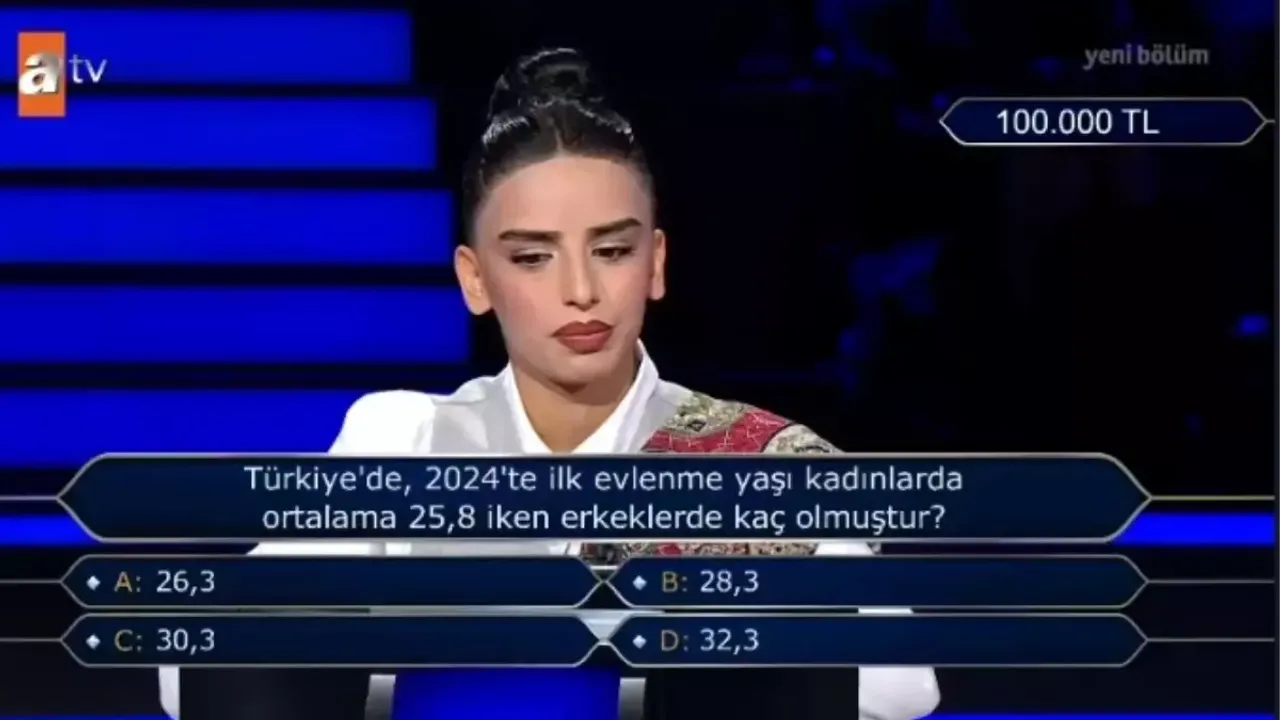 ATV ekranlarında yayınlanan Kim Milyoner Olmak İster yarışmasında sorulan her yeni soru, ekran başındaki izleyiciler için hem bilgi sınavına hem de eğlenceli bir öğrenme sürecine dönüşüyor. Yarışmanın son bölümünde sorulan “Türkiye'de, 2024'te ilk evlenme yaşı kadınlarda ortalama 25,8 iken erkeklerde kaç olmuştur?” sorusu da izleyicilerin dikkatini çekti ve cevabı Google’da en çok arananlar listesine girdi.