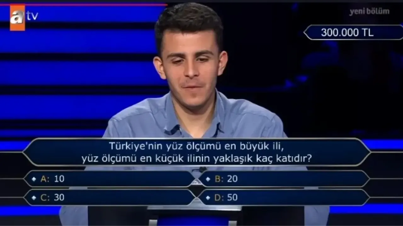 Haberin Burada’nın haberine göre, “Kim Milyoner Olmak İster” yarışmasının son bölümünde sorulan “Türkiye’nin yüz ölçümü en büyük ili, en küçük ilinin yaklaşık kaç katıdır?” sorusu izleyiciler arasında büyük ilgi yarattı. Bilgi yarışmasının hem öğretici hem düşündürücü yapısı, izleyenleri ekran başına kilitlerken, sorunun doğru cevabı da merak konusu oldu.