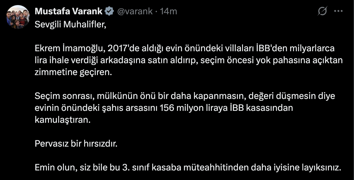 Varank, İmamoğlu'nu "pervasız bir hırsız" olarak nitelendirerek, İmamoğlu'nun 2017'de aldığı evin önündeki villaları İBB'den milyarlarca lira ihale verdiği arkadaşına satın aldırdığını ve seçim öncesi bu villaları yok pahasına zimmetine geçirdiğini iddia etti.