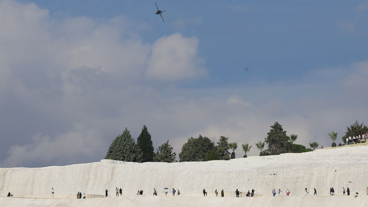Türk Hava Kuvvetleri’nin akrobasi timi SOLOTÜRK, 29 Ekim Cumhuriyet Bayramı kutlamaları kapsamında UNESCO Dünya Mirası Listesi'ndeki Pamukkale’de gösteri uçuşu gerçekleştirdi.