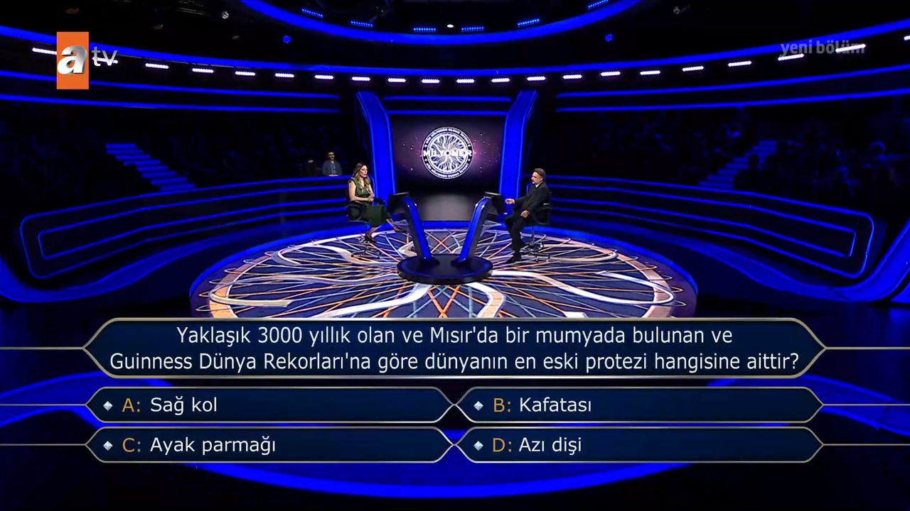 ATV’de yayınlanan “Kim Milyoner Olmak İster?” yarışmasında bu hafta tarih ve arkeoloji meraklılarının ilgisini çeken bir soru yöneltildi. Yarışmacıya, Mısır’da bulunan bir mumyada keşfedilen ve Guinness Dünya Rekorları tarafından dünyanın en eski protezi olarak kabul edilen buluntunun hangi vücut parçasına ait olduğu soruldu.