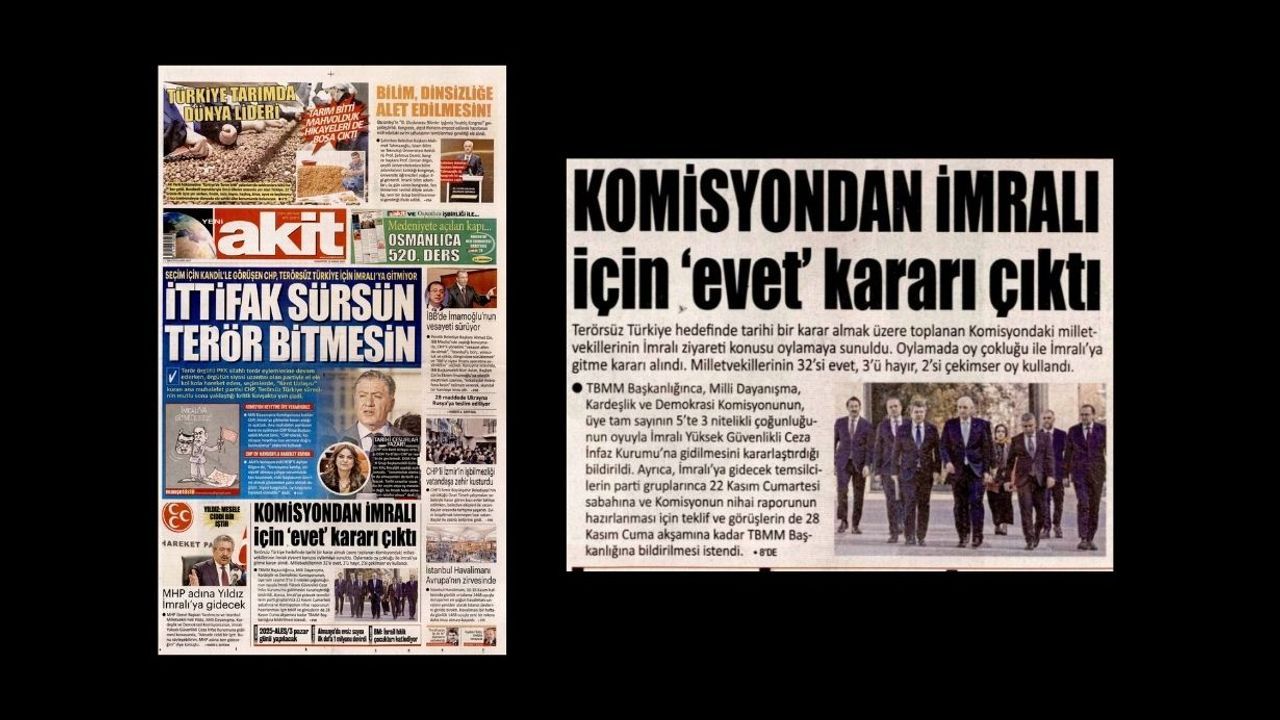 TBMM Başkanlığınca, Milli Dayanışma, Kardeşlik ve Demokrasi Komisyonunun, üye tam sayının 5’te 3 nitelikli çoğunluğunun oyuyla İmralı Yüksek Güvenlikli Ceza İnfaz Kurumu’na gidilmesini kararlaştırdığı bildirildi. Ayrıca, İmralı’ya gidecek temsilcilerin parti gruplarınca 22 Kasım Cumartesi sabahına ve Komisyonun nihai raporunun hazırlanması için teklif ve görüşlerin de 28 Kasım Cuma akşamına kadar TBMM Başkanlığına bildirilmesi istendi."