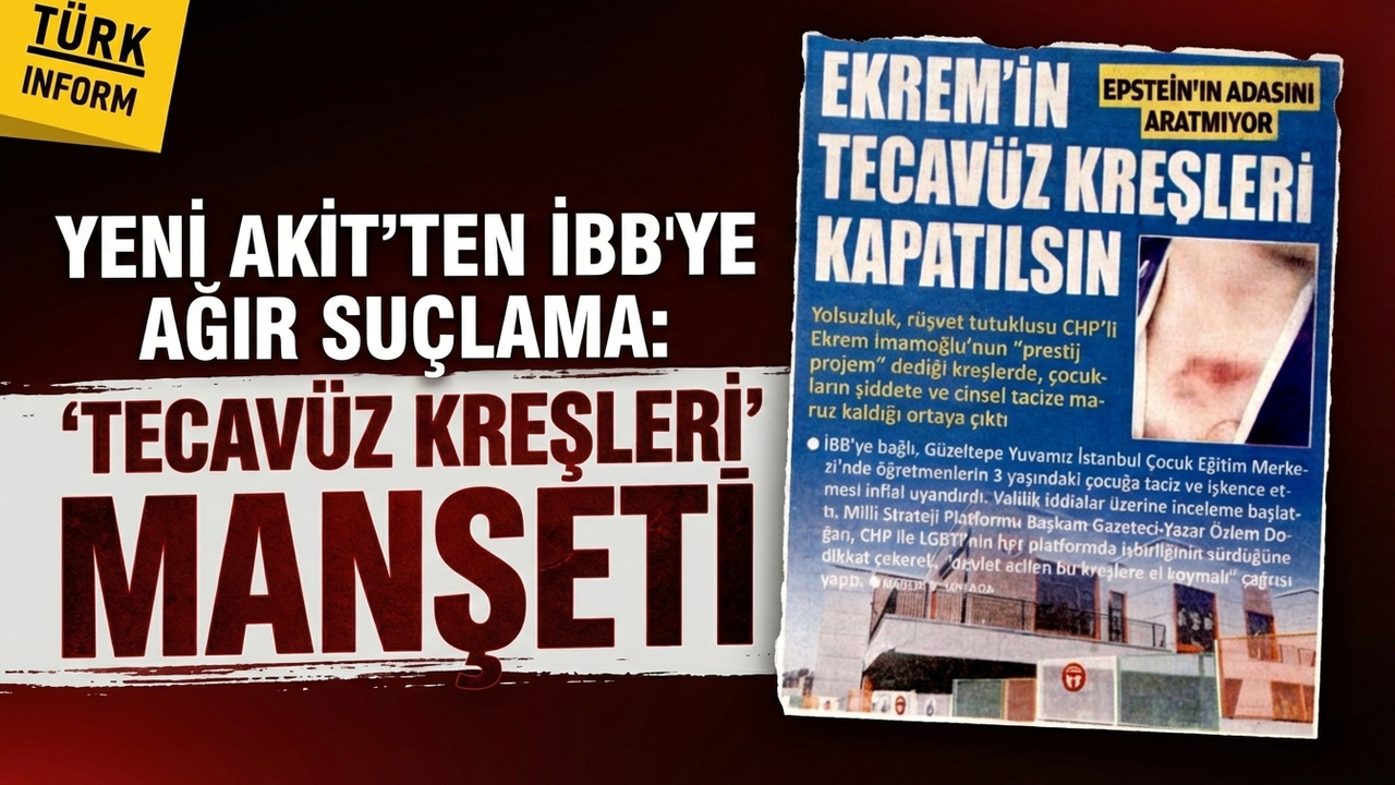 Yeni Akit gazetesi, bugünkü sayısının manşetinde İBB Başkanı Ekrem İmamoğlu'nu ve belediyeye bağlı kreşleri, "Ekrem'in tecavüz kreşleri kapatılsın" başlığıyla hedef aldı. "Yolsuzluk, rüşvet tutuklusu CHP'li Ekrem İmamoğlu" ifadelerinin yer aldığı haber metninde, İmamoğlu'nun "prestij projem" dediği kreşlerde çocukların şiddet ve cinsel tacize maruz kaldığı iddia edildi.