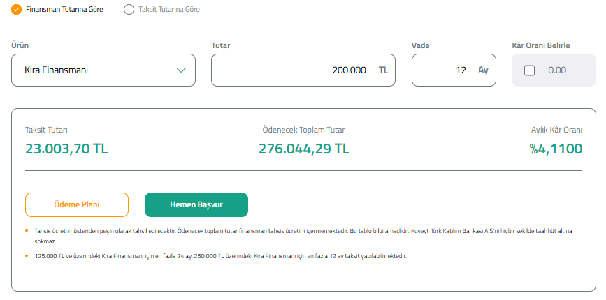 12 ay vadeyle 200 bin lira tutarında Kira Finansmanı kullanan bir müşteri, aylık yüzde 4,11 kâr oranı ile 23 bin 3 TL taksit ödeyerek toplamda 276 bin TL geri ödeme yapıyor. Finansmandan yararlanmak isteyenlerin Kuveyt Türk müşterisi olması ve başvuru sırasında kiralanacak konuta ait tapu ile güncel kira sözleşmesini ibraz etmesi gerekiyor.