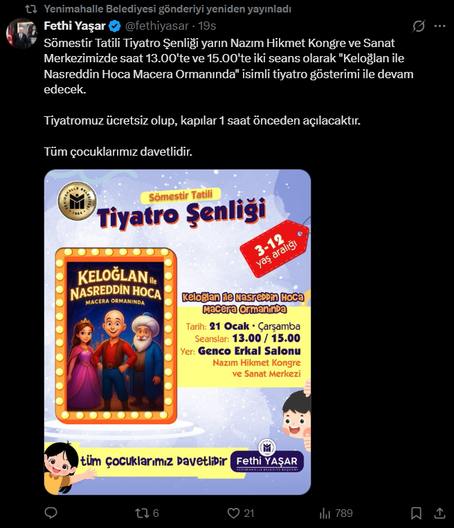 Sömestr tatili kapsamında düzenlenen tiyatro gösteriminin ücretsiz olduğu açıklandı. Etkinliğin 3–12 yaş aralığındaki çocuklara yönelik olduğu ve tüm çocukların davetli olduğu belirtildi.